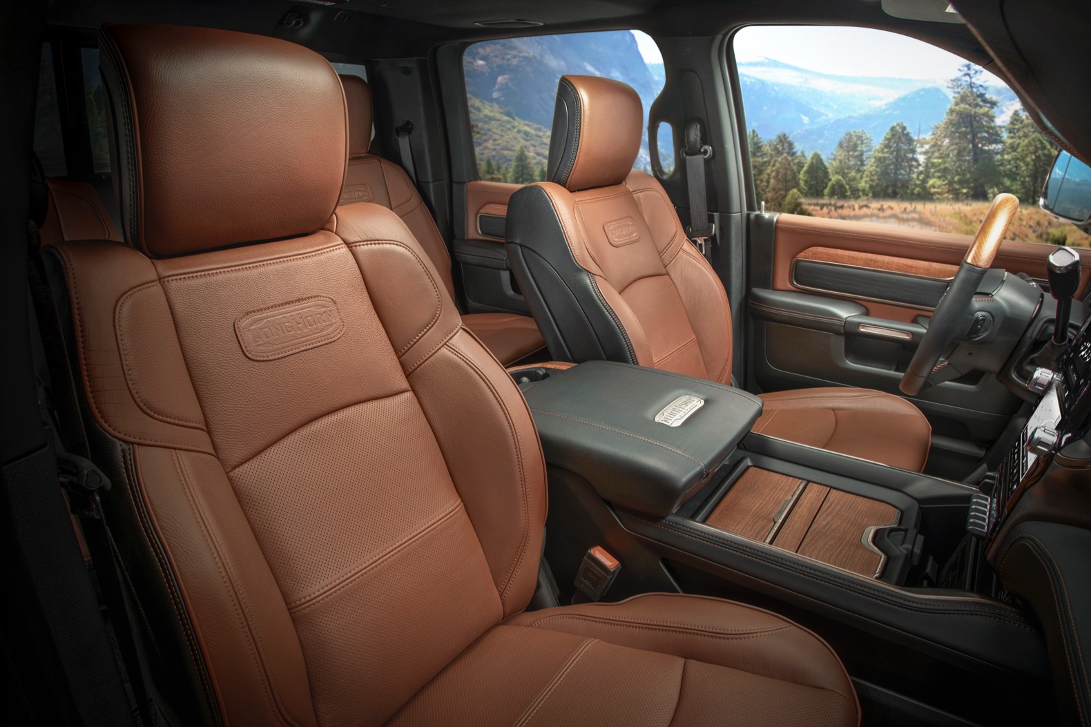 Inside you’ll find lots of leather and real wood. A new alligator skin-embossed surface covers the center console, instrument panel, seats and door-panel inserts. Satin warm-chrome accents have also been added, in addition to a new burned-in “Longhorn” branding mark on upper glove box. Ram also says that at night the interior’s ambient lighting creates a soothing atmosphere for passengers.