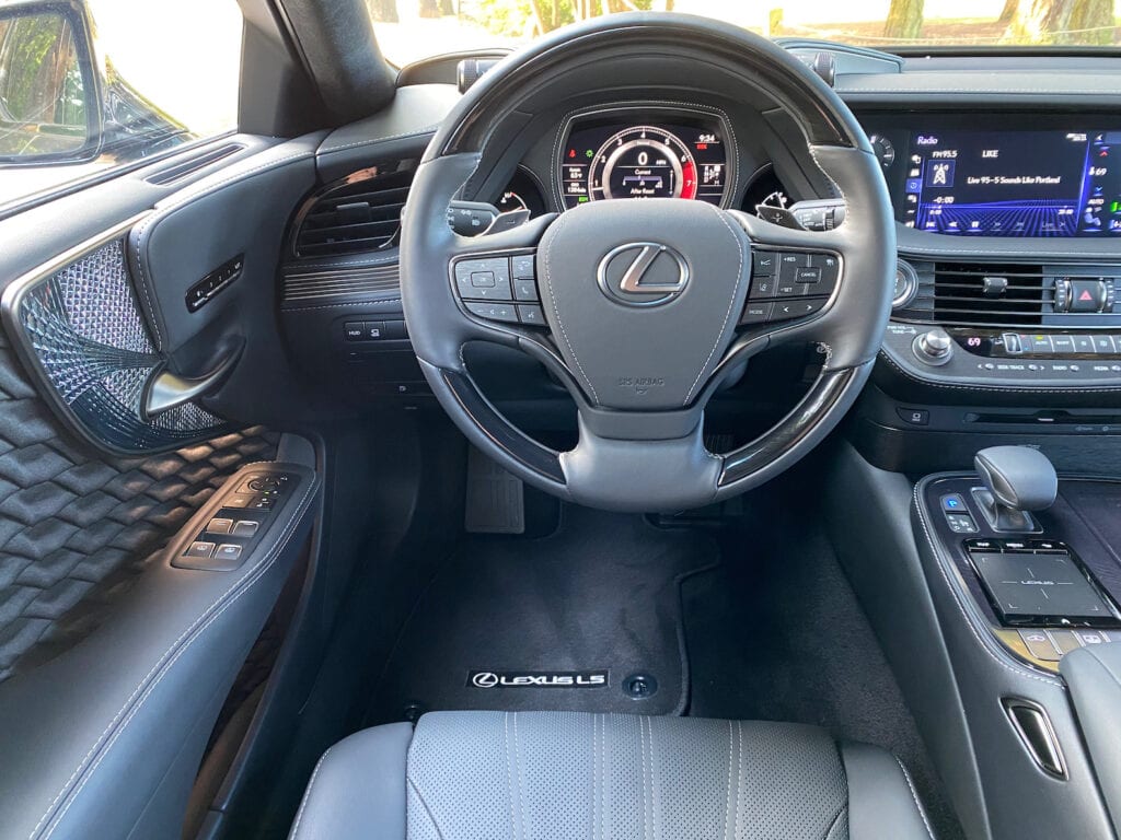 Realistically, you may spend about as much time working your way through the available trim combinations to pick between various wood and glass interior trims. Though Lexus doesn’t allow as much mixing and matching as some competitors, there are still a lot of choices. Most fancier interior hues require a $3,700 interior upgrade package that includes softer leather trim and a synthetic suede headliner. Our favorite interior trim being the Kiriko glass. The LS is also available with the optional F Sport package. Its stiffer suspension, sportier wheels, and revised styling help give this big four-door a slight sporty attitude.