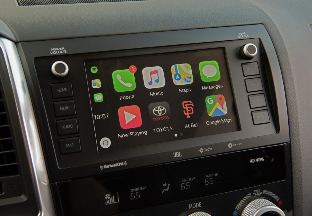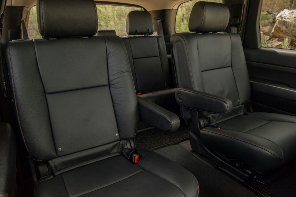 Interior materials are basic, with scratchy plastic trim on the dash and doors. Many versions have shiny silver plastic that looks like a throwback, but not in an offensive way. The optional fake wood trim looks better by comparison. The dash itself looks like it was designed for a truck with a bench seat, but we like the fact it’s slightly angled towards the driver making the controls easier to reach. The standard 7.0-inch touchscreen is swallowed up by the big dash with its outlandishly large control knobs and buttons. If you must, perhaps order one with the rich brown leather available on costly versions. Luckily the 2020 Toyota Sequoia now includes advanced smartphone functions with standard Apple CarPlay and Android Auto compatibility.