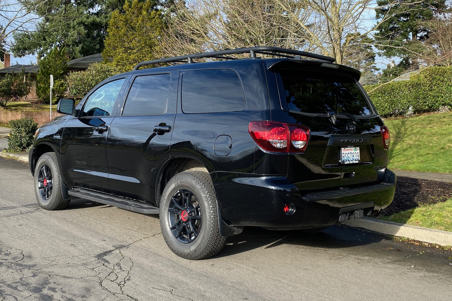 Underneath, the Sequoia rides on a separate ladder frame similar to the Tundra full-size pickup and features an independent front suspension paired with a solid rear axle suspended by coil springs. That’s hardly high tech, but it works well enough to deliver a competent ride. The taller sidewalls on the SR5 and TRD Pro trims quell bumps better than the 20” wheels and shorter sidewalls standard on other trims. Sequoia TRD Pros also make use of trick Fox shocks that deliver a remarkably comfortable ride on pavement while soaking up big bumps off-road. The Sequoia is awfully big for four-wheeling, but the TRD Pro has more chops than we expected. Depending on configuration, the Sequoia is rated to tow between 7,000 and 7,400 pounds. That’s not as hefty as some competitors, but the strong engine means it doesn’t struggle with a hefty trailer out back.