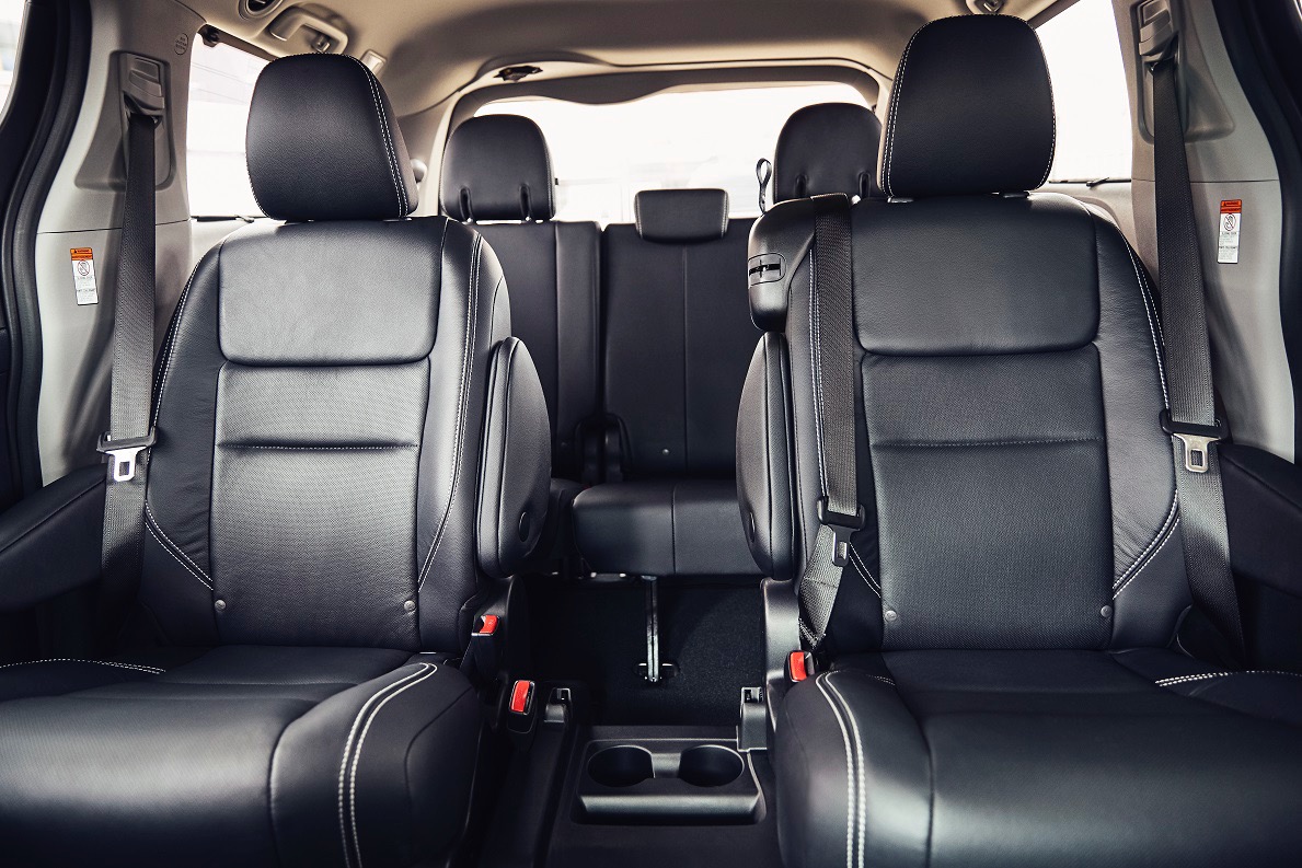 The 2020 Toyota Sienna stretches about 200 inches from bumper to bumper, meaning it’s large both inside and out. Its doors slide open to reveal 164.4 cubic feet and a highly configurable cabin. There’s seating for eight, or seven with the optional second-row captain’s chairs, and the middle seats can be removed to turn the Sienna into an enormous cargo van. Unfortunately, the Sienna’s second-row seats don’t stow away in the floor and instead have to be unlatched and lifted out. In the top Sienna Limited trim, the second row captain’s chairs recline and feature foot rests and leg cushions.