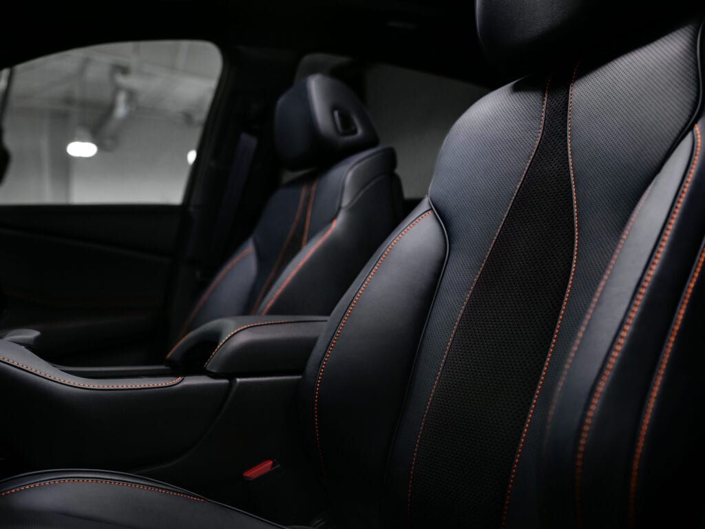 Inside the orange theme continues with orange stitching on the seats, center console, door panels, steering wheel and floor mats. A 10.5-inch color Head-Up Display, 16-way power seats wrapped in Ebony Milano leather and Ultrasuede, a heated steering wheel and heated outboard rear seats are also included.