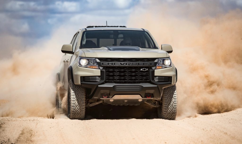 The Colorado ZR2 is the only Colorado model to feature the lettered, flow-through “Chevrolet” front fascia. According to Chevy, the ZR2’s new front end provides drivers with improved visibility. The Colorado ZR2 also comes with the Multimatic DSSV position-sensitive dampers, standard front and rear electronic locking differentials, a 2-inch suspension lift, a 3.5-inch wider track, off-road rocker protection, cast iron control arms, Autotrac transfer case, multiple skid plates, and red tow hooks. The 2021 Colorado ZR2 will debut this month at the SEMA show in Las Vegas.