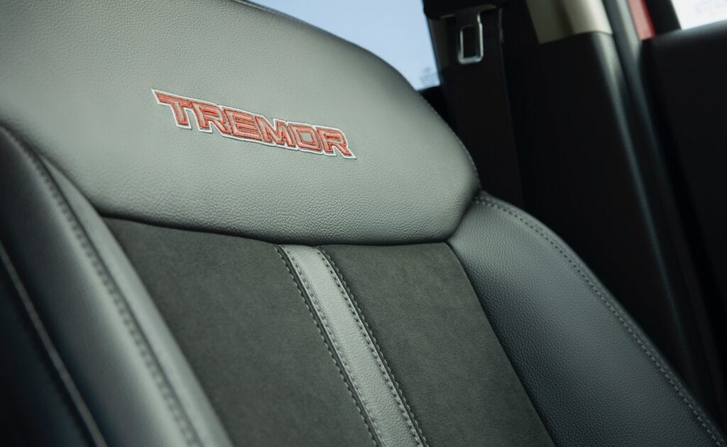 The Tremor Off-Road Package adds a lifted suspension, redesigned front knuckles and 32-inch Continental General Grabber A/TX all-terrain tires with 17-inch Magnetic-painted wheels that combine to deliver 9.7 inches of ground clearance – 0.8 inches more than the base Ranger SuperCrew 4×4. The suspension has also been upgraded with FOX 2.0 monotube dampers with rear piggyback reservoirs and hydraulic rebound stops, specially tuned shocks and tweaked front and rear springs.