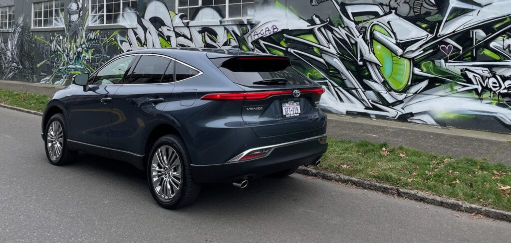 The 2021 Toyota Venza has an upscale look that bests current Lexus styling. The Venza’s quite handsome. It skips the RAV4’s angular, upright, macho looks for a more sculpted, softer, and more upscale look with a flowing coupe-like roofline. Highlighted by chrome trim on the outside and wrapped surfaces on the inside, the 2021 Toyota Venza channels its inner Lexus in a way even current Lexus crossovers can’t match. The roofline features a coupe-like rake at the rear that gives it a racier look compared to the last Venza and the current RAV4 and Highlander. It combines standard chrome trim and either chrome or polished aluminum wheels to create an upscale appearance. Around back, the Venza skips the taller Highlander taillights for a sculpted tail with thinner LEDs that span the width of the hatch.