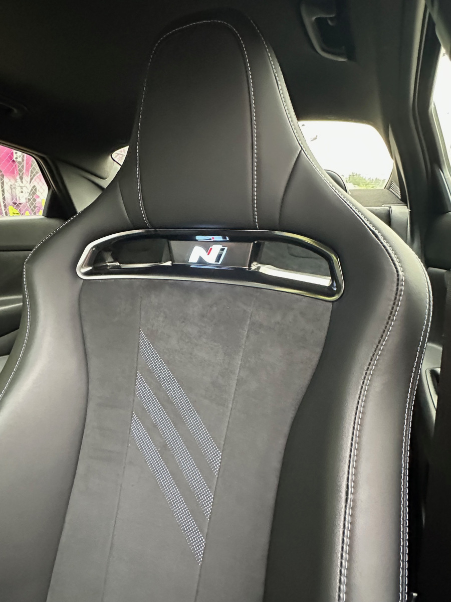 Larger and slightly heavier than the Veloster N and the Elantra N Line, the Elantra N adds a cross brace behind the rear seats for more stiffness. Three damping settings reduce the squish on the front when braking hard before a turn, but body roll and understeer are present in the front-drive compact. Mitigating this, an electronic limited-slip rear differential sends power to the outside wheel and Hyundai equips the Elantra N with Pro Pilot Sport 4S summer performance tires as standard. The Elantra N with the manual outperforms the DCT when it comes to efficiency, which is unusual with modern manuals. The EPA rates it at 22/31/25 mpg, whereas the 8-speed automatic pulls up the rear at 20/30/23 mpg.