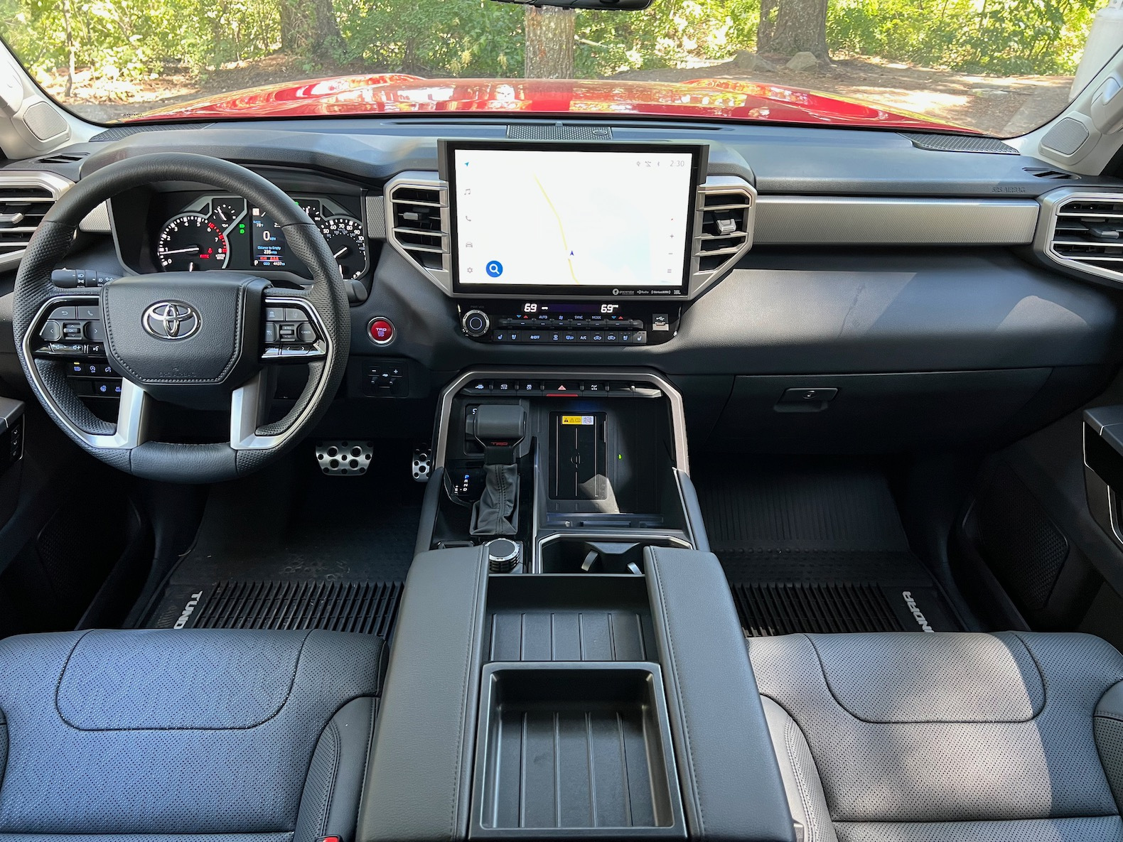 A large volume dial comes on either the 14-inch or standard 8.0-inch touchscreen. Standard equipment includes wireless Apple CarPlay and Android Auto, three USB ports, keyless start, power features and a power tailgate. Options include a panoramic roof, heated and cooled front seats, and heated steering wheel. An available 12.3-inch digital instrument cluster comes standard with the hybrid engine and on Platinum, 1794, and TRD Pro models. The standard cluster on SR and SR5 models has a 4.1-inch vehicle info display. A wi-fi hotspot enables connections for up to 10 devices, and available navigation stays fresh with over-the-air updates.