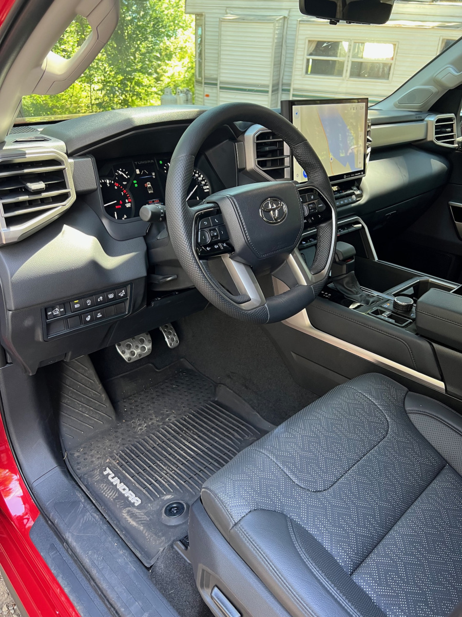 The base Tundra SR costs $37,645, including a $1,695 destination charge. Our compass needle points to the Limited trim, which, together with the SR5, accounted for about 70% of sales of the outgoing model. The Limited adds the bump switch on the power tailgate, heated power side mirrors, the 14.0-inch touchscreen, a 12.3-inch digital gauge cluster (Hybrid only), power rear window (crew cab only), synthetic leather seats with 8-way power front seats, heated and cooled front seats, soft-touch console and door panels, leather-trimmed steering wheel that’s heated, and blind-spot monitors. We’d get the Limited Hybrid for more power, more torque, and greater acceleration or efficiency.
