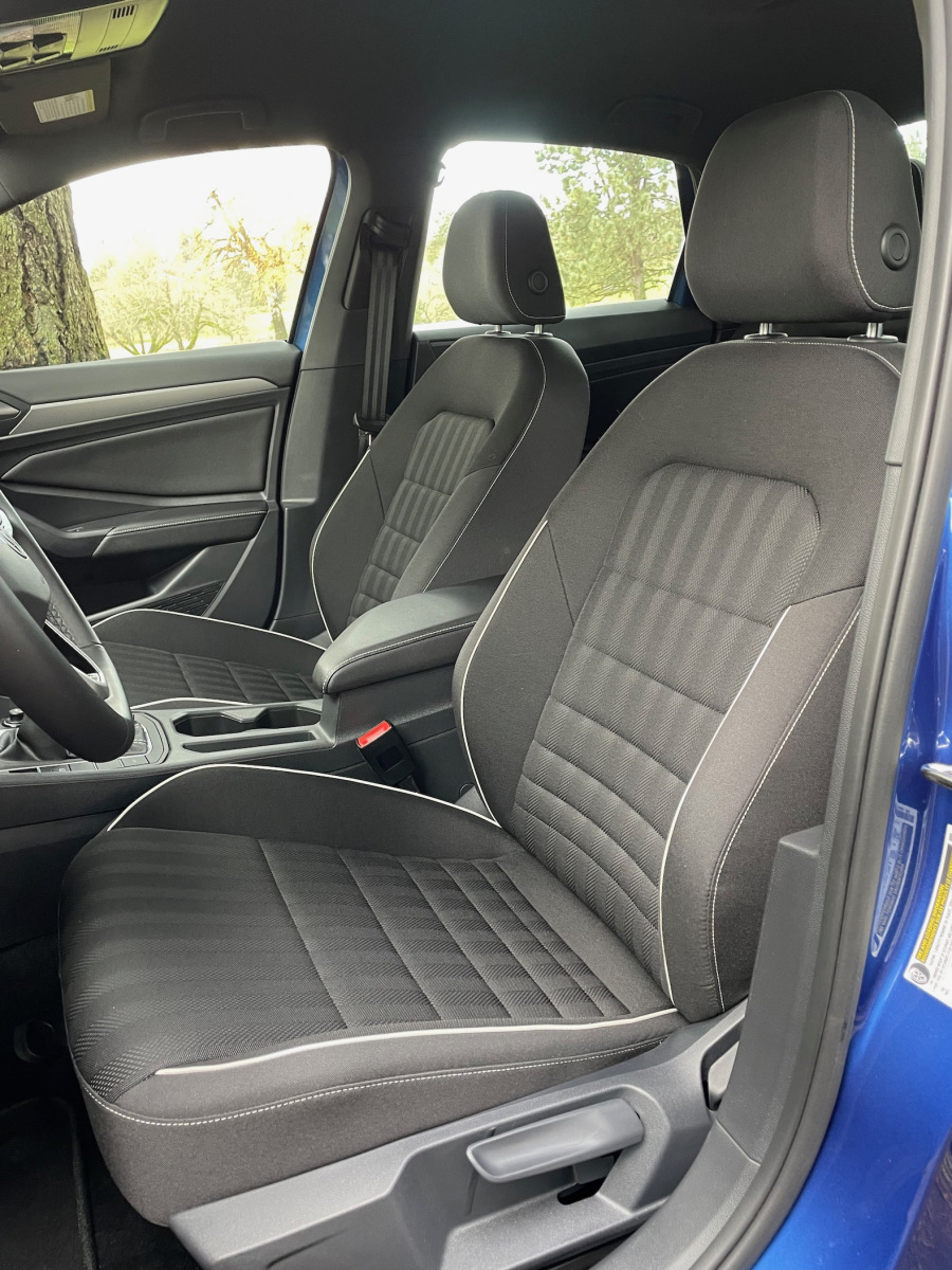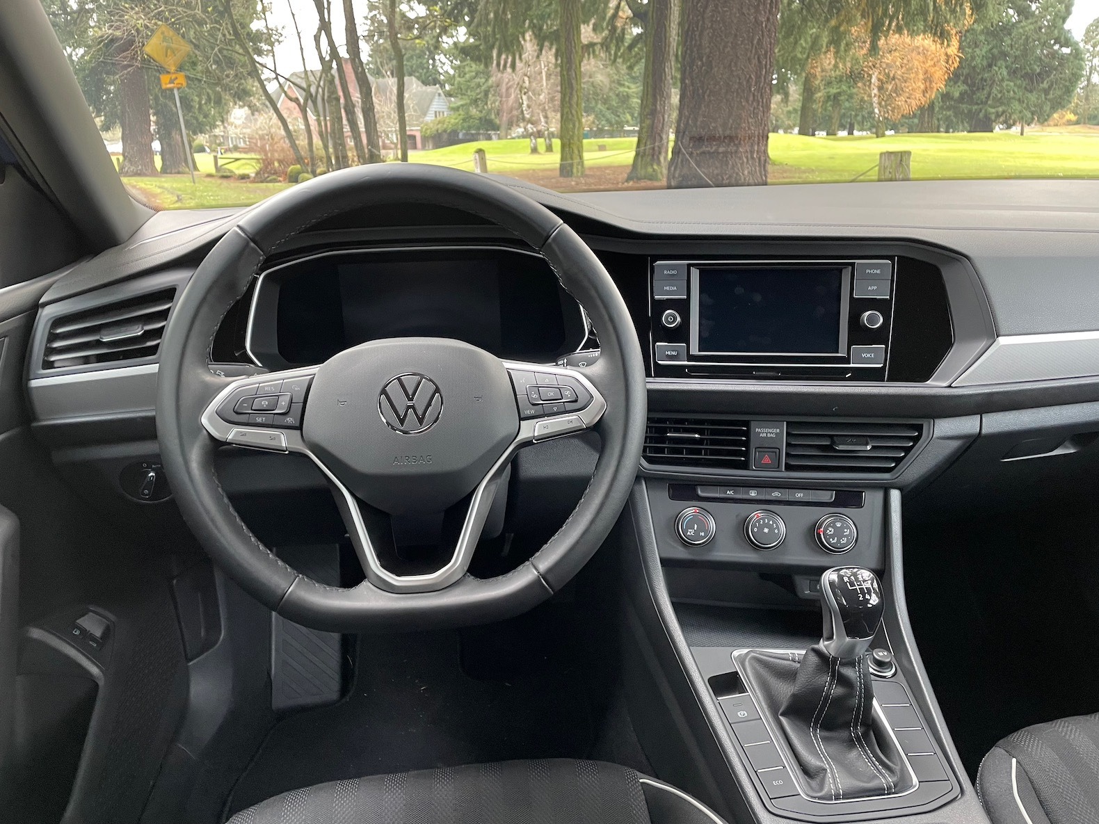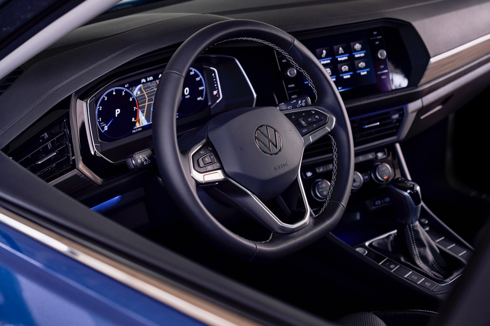 For 2022, not too much is new on the outside except new front and rear lower bumpers, as well as standard LEDs on the headlights, taillights, and daytime running lights. Inside there’s a standard 8.0-inch digital instrument cluster, contrast stitching on the doors and armrests, and new cloth or leather seat patterns. VW swaps out engines for a 1.5-liter turbo-4 used in the VW Taos small crossover. A new Sport trim steps above the S and below SE and SEL trims to add flair and fun on a budget, with 17-inch alloy wheels, an electronic limited-slip front differential, and black trim elements.