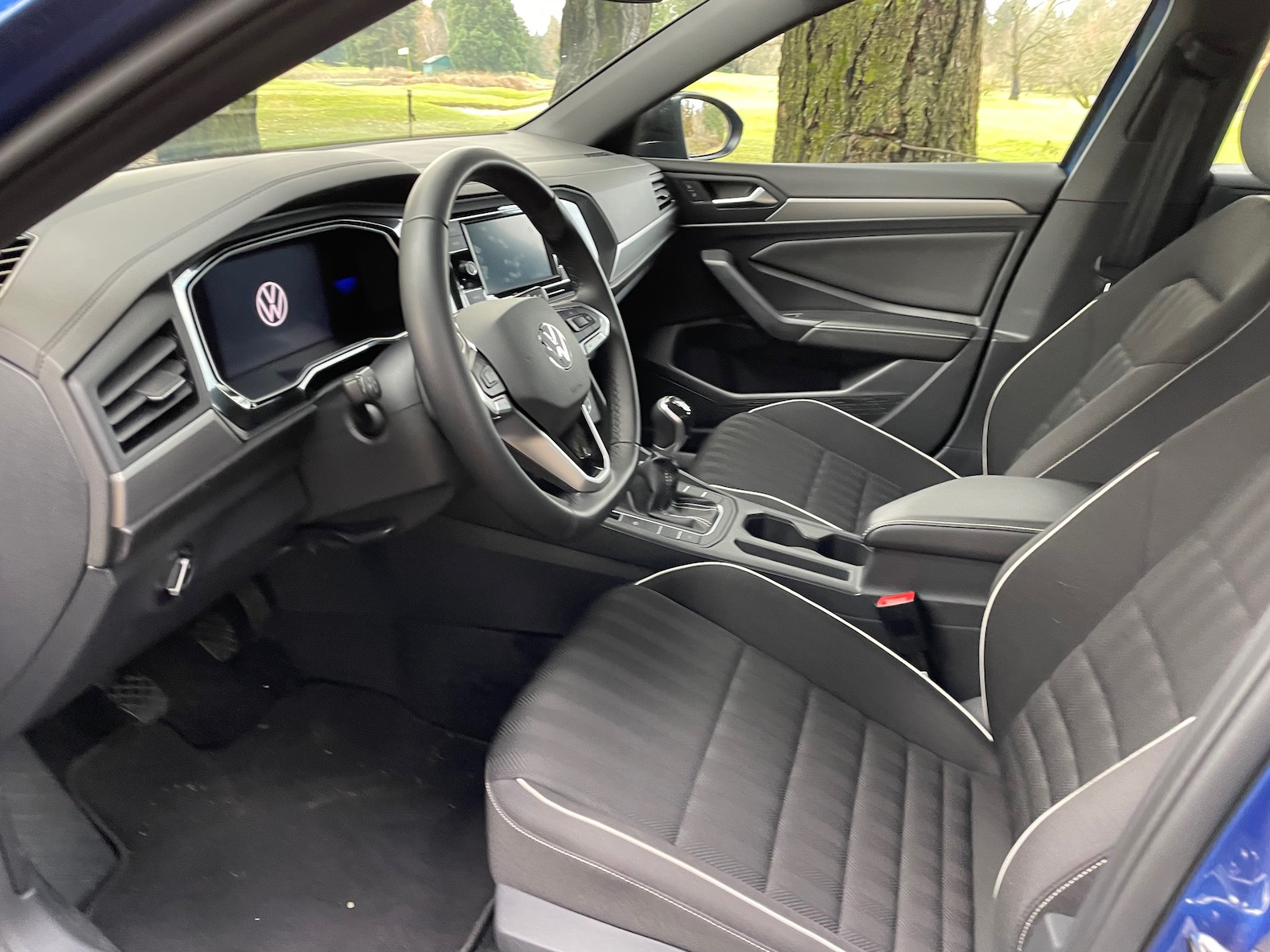A larger 1.5-liter turbo-4 replaces last year’s pokey 147-hp 1.4-liter turbo-4, and it shaves the Jetta’s 0-60 mph to under eight seconds with the 8-speed automatic. A 6-speed manual comes standard. The same EA211 engine is used in the heavier 2022 Volkswagen Taos small crossover, making 158 hp and 184 lb-ft of torque here. A bit of lag gives way to a spirited surge when the torque comes on as early as 1,500 rpm. At light throttle or letting off abruptly, the engine paired with the 8-speed can dance.