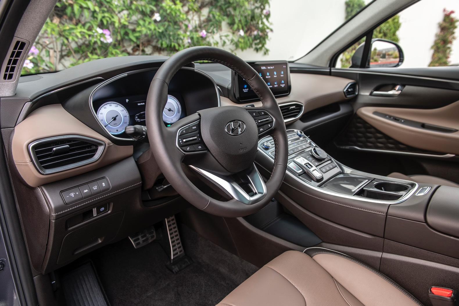 Under the hood, the Santa Fe offers a variety of powertrain options. A standard 2.5-liter inline-4 produces 191 horsepower, while a turbocharged 2.5-liter engine delivers a more robust 277 horsepower. For those seeking efficiency, the hybrid variant combines a 1.6-liter turbocharged engine with an electric motor for a combined 226 horsepower. All engines are mated to an 8-speed automatic transmission, with front-wheel drive standard and all-wheel drive available for extra traction.