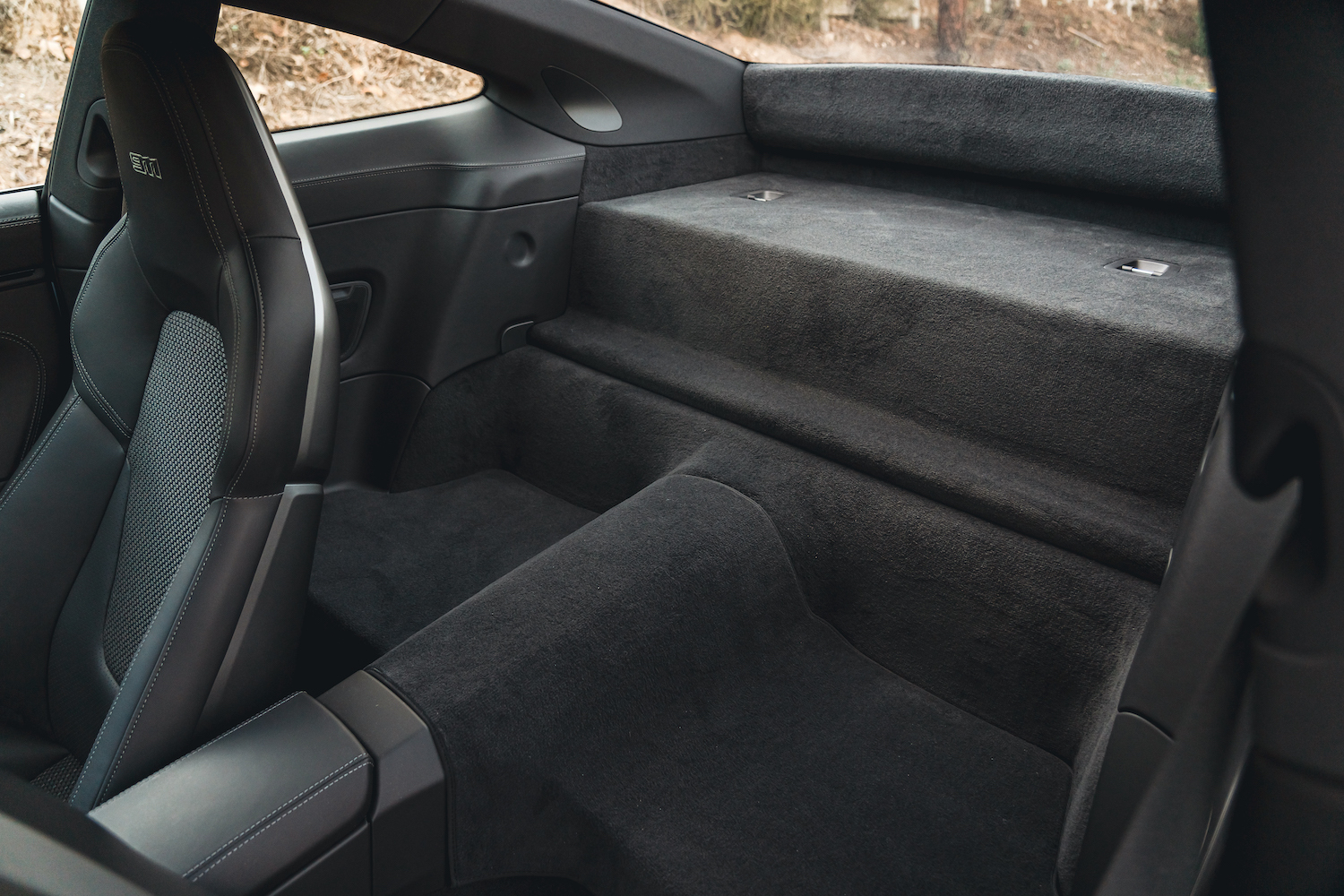 As for weight savings, the majority of it comes from jettisoning the 911’s pretty-much-useless rear seats. (You can add them back in if you want, but, like, why?) Thinner glass is also part of the package, which does make the cabin somewhat louder than a standard 911, but not so much that it’ll bother you day to day. All told, Porsche says the Carrera T is around 100 pounds lighter than the base 911.