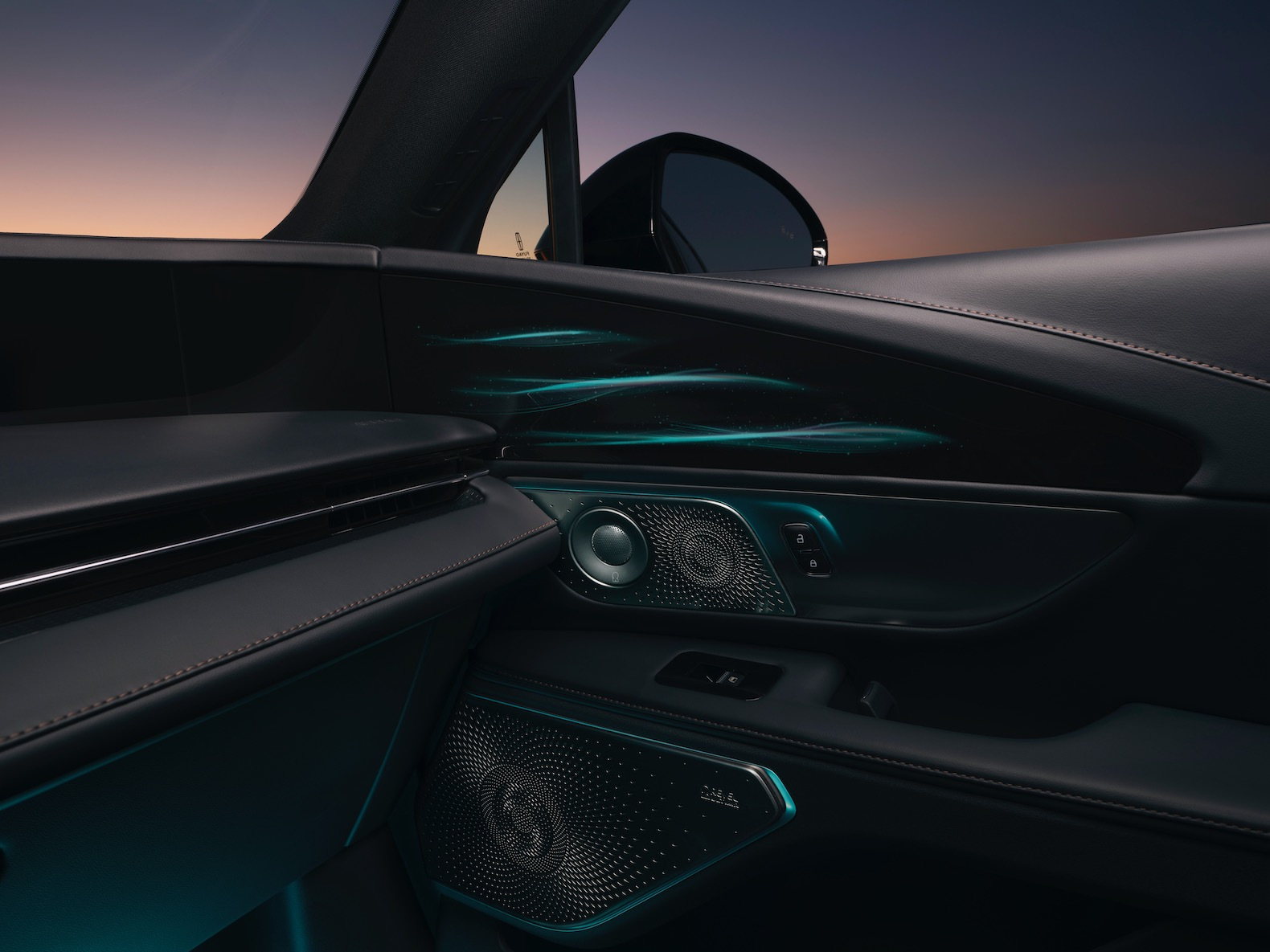 Inside is probably what everyone is going to talk about. There are two 24-inch screens that combine to create a 48-inch screen. The large screen is controlled by an 11.1-inch touchscreen below. The driver can customize the large display by dragging and dropping different widgets on the touchscreen. The 48-inch screen flows into a trim on doors that’s backlit by LEDS that can also change colors.
