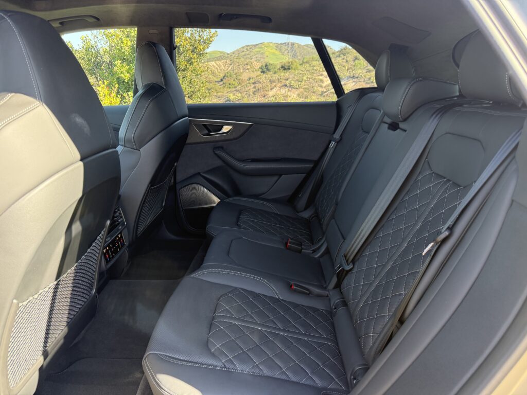 The Q8 wraps up to five people in lavish comfort. Audi takes the Q7 and deletes the skimpy third-row seat, then plushes up nearly every surface not made of glass, all to fabulous effect. Good front and back seats, and good cargo space, combine with exceptional fit and finish. The Q8 measures 117.9 inches in wheelbase, and 196.6 inches overall. It’s a big SUV, and with all the space devoted to five people (or four with the Executive package), it’s spacious in every dimension. The front seats have great support and adjustments, and come with heating and available cooling and massaging.