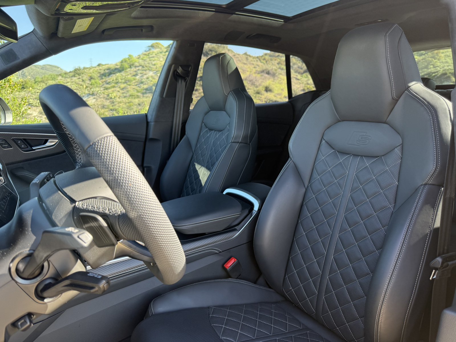 Blisteringly quick acceleration couples with an air suspension that smothers bumps without jostling the passengers much even when rolling on 23-inch wheels. With electronically controlled anti-roll bars, the RS Q8 remains shockingly, almost alarmingly confident, no matter what the road—and those manners can extend in large part to the more basic Q8, if it’s configured with the air suspension and grippiest tires. In any trim the Q8’s an SUV that does its best to defy its height and weight and succeeds. Every Q8 comes with all-wheel drive, but one look at its high-performance tires should deter you from planning any overlanding in it.