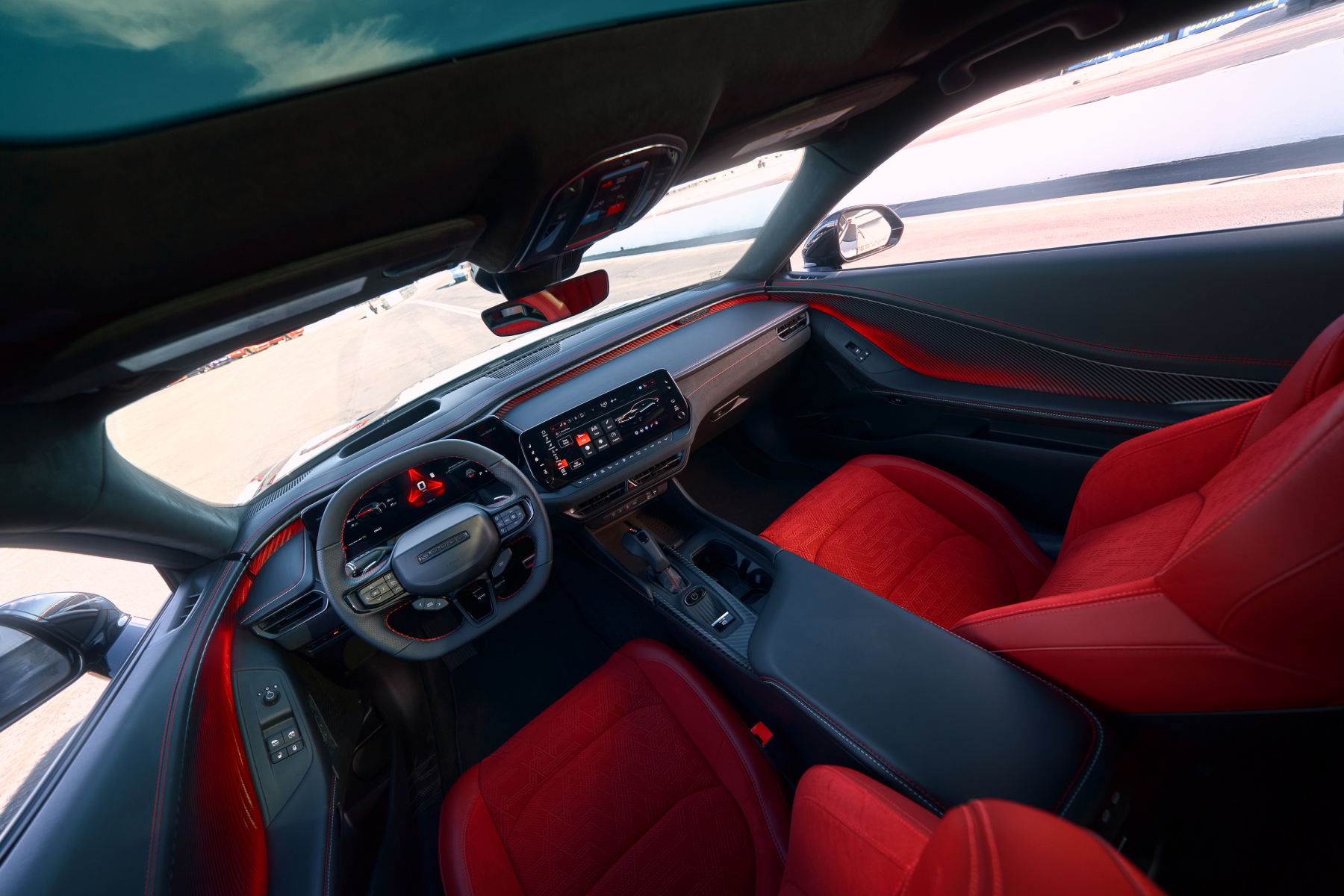 Technology is anchored by Dodge’s Uconnect 5 infotainment system, displayed on a large 12.3-inch touchscreen with crisp graphics and responsive controls. Wireless Apple CarPlay and Android Auto are standard, as is wireless charging and multiple USB-C ports. Optional features include a head-up display, premium audio systems, and a customizable digital gauge cluster with performance pages that show torque, power, battery status, and performance metrics. Over-the-air updates keep the system current, and connected services offer remote climate control, charging scheduling, and vehicle monitoring.