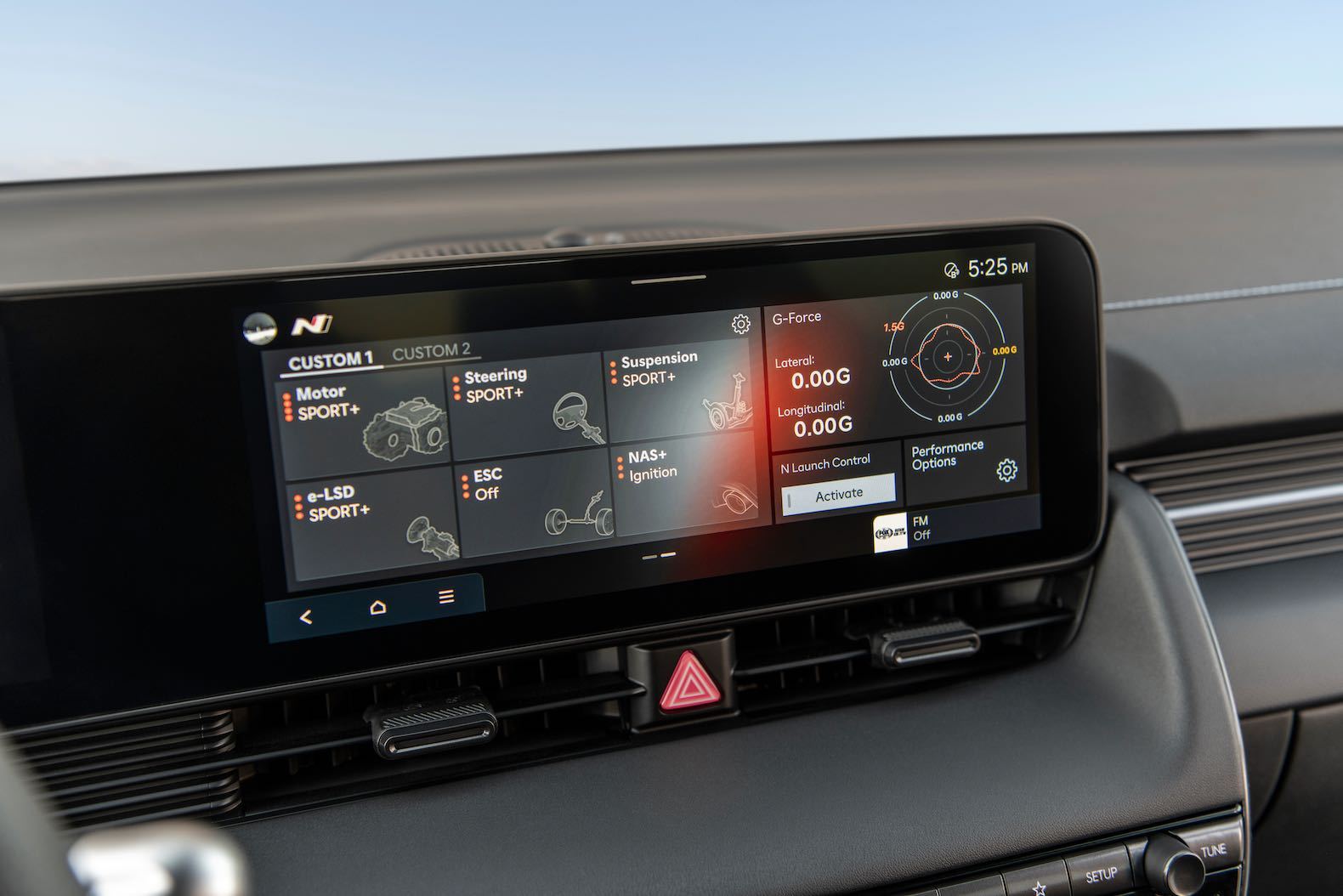 Inside, 2025 Hyundai Ioniq 5 N buyers will also find numerous N family upgrades. These upgrades include an N-branded steering wheel, seats, door scuff panels, and metal pedals. The 2025 Hyundai Ioniq 5 N features a newly designed N steering wheel with the N logo at its center and two “N buttons” that can be linked to customized drive mode settings. This new steering wheel also features a button for the N Grin Boost mode that affords the driver access to maximum acceleration in ten-second bursts. Other interior upgrades include a track-optimized center console with knee pads and shin support and an extension on the lower console that Hyundai says “enhances rigidity to further support sporty driving.” This extension also houses USB-C ports, a wireless phone charger, and cup holders. Unique N seats with reinforced bolsters feature a two-tone design and illuminated N emblems, and redesigned pedals, optimized for improved foot contact, can be found with a new checkered-flag theme as a tribute to motorsport competition. Just as with the standard Hyundai Ioniq 5, the 2025 Hyundai Ioniq 5 N features various sustainable materials on its interior.