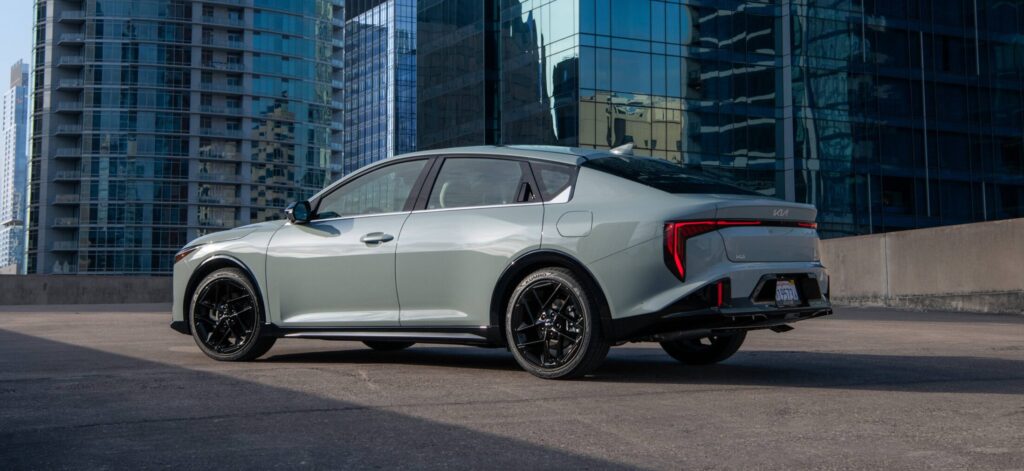 The exterior styling of the 2025 K4 immediately sets it apart from many conservative compact sedans. Its proportions are sleek and athletic, with a fastback-inspired roofline that gives it a dynamic profile while still retaining a traditional trunk. The front end features bold, vertically oriented lighting elements that give the car a distinctive face, paired with a wide grille that emphasizes its planted stance. Subtle character lines along the sides add visual interest without feeling busy, and integrated rear door handles contribute to a cleaner, more upscale look. At the rear, sharp taillight graphics and a neatly sculpted bumper complete a design that feels contemporary and confident, helping the K4 stand out in a segment that often favors understated styling.