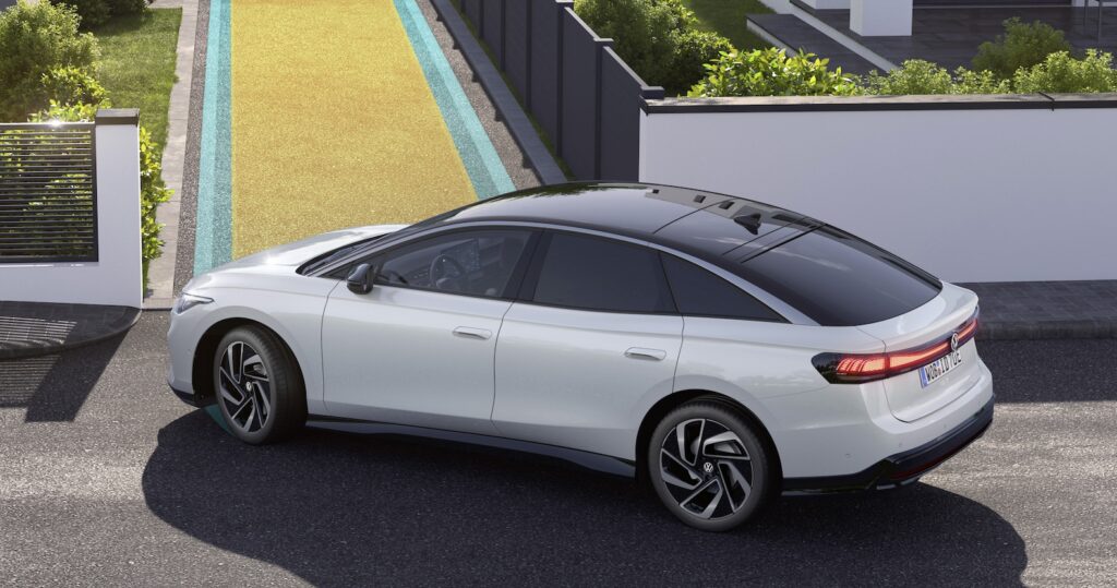 The ID.7 is solidly in the midsize class. It measures 60.5 inches tall, 73.3 inches wide and 195.3 inches long riding on a 117 in wheelbase, although Its design makes it appear even longer. And it allows for 18.8 cubic feet of cargo space, expanding to 56 cubic feet with the rear seats folded.
