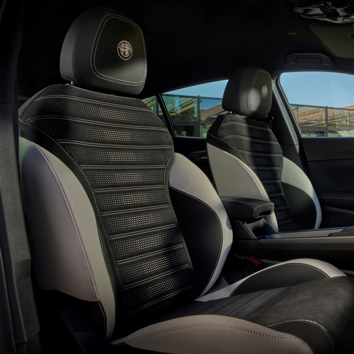 - Sprint: 18-inch wheels, gloss black body kit, LED lighting, aluminum pedals, and fabric seats with Alfa Romeo logos. Options include leather upholstery, a black roof, and ventilated seats.