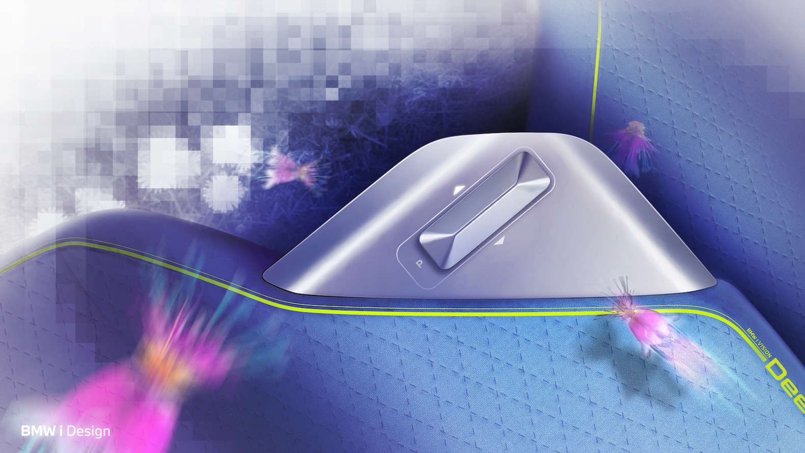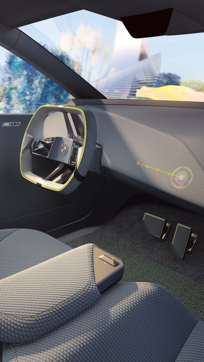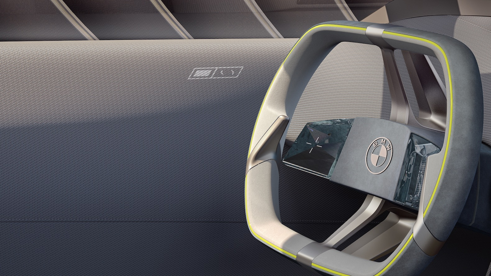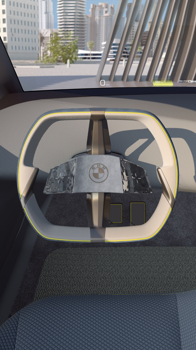 Inside you won’t really find any buttons or knobs, since all of the controls are accessed via voice commands. You’ll also notice that there isn’t a traditional digital instrument cluster in front of the driver, instead all the important information is projected onto the entire width of the windshield, which is basically a really large head-up display. The amount of information displayed is customizable through touch-sensitive controls on the dashboard, which BMW calls the Mixed Reality Slider. There are five different levels with the top level dimming all the windows to create a virtual reality.