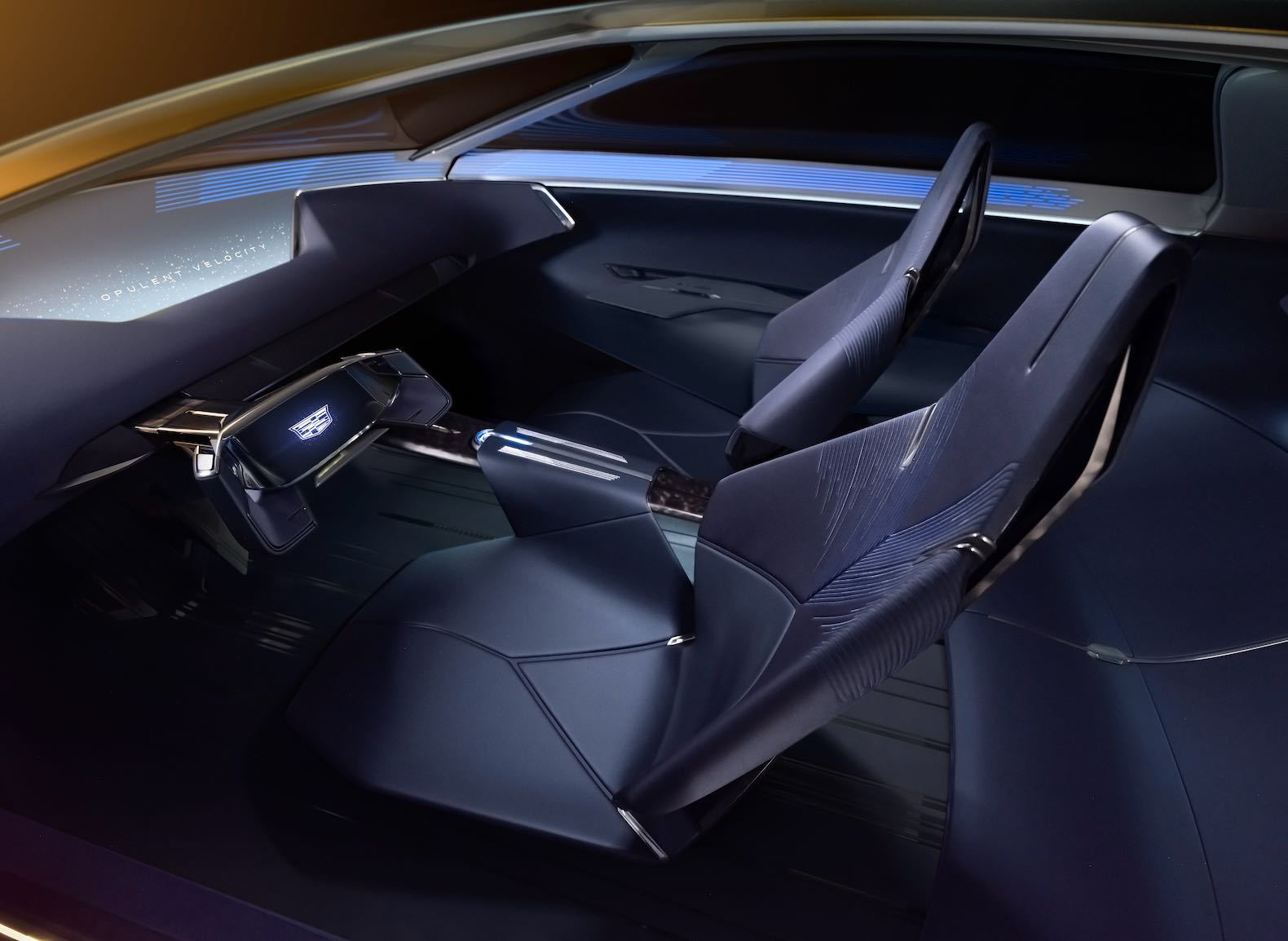 Access to the interior is via two giant butterfly doors where occupants will find a surprisingly minimal cabin finished in a stunning deep blue color called “Selene Blue.” The Cadillac Opulent Velocity concept’s seating is made from flax fibers under a layer of silver pearl flakes. How opulent. Passengers will find a widescreen display atop the dash with a secondary screen in the center of the automatically deploying yoke steering wheel.
