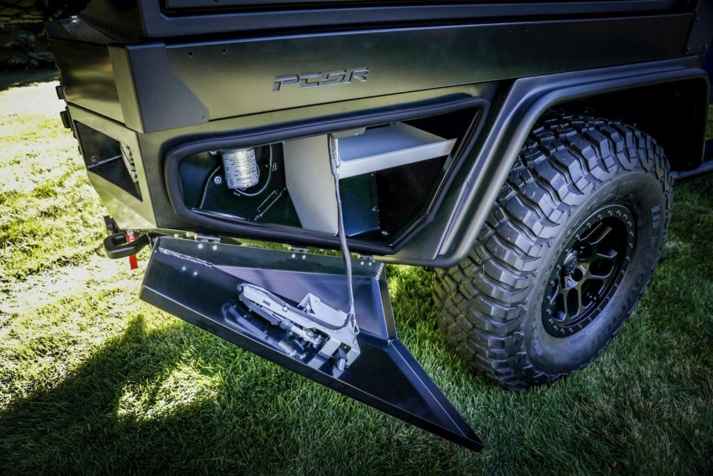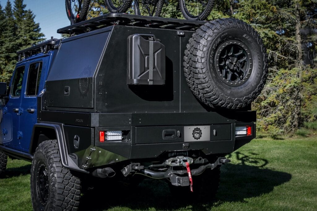 Above the cab area there’s also two racks for additional storage space with dual concept exterior task lights mounted on each side. Other upgrades include, 17-inch beadlock-capable wheels with 34-inch tires, a two-inch lift kit with Fox shocks and steel fender flares.