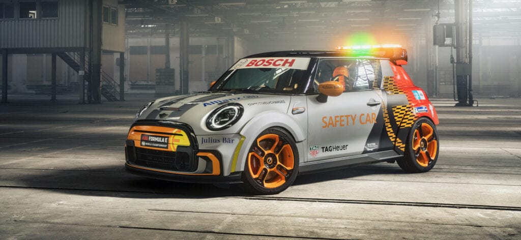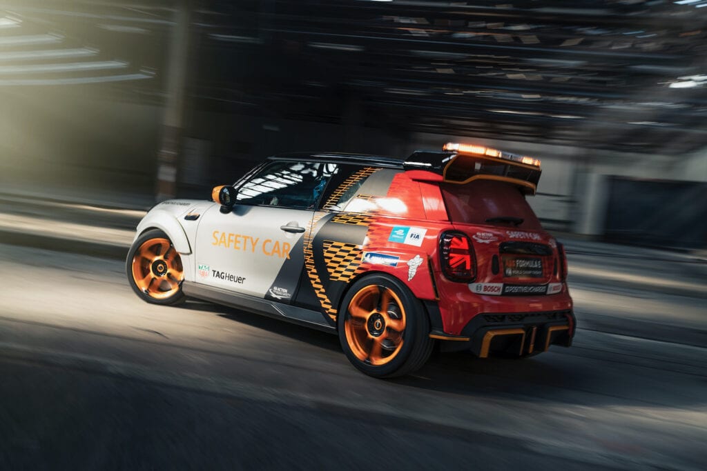The Pacesetter is a fully electric hatchback that will do duty as the new safety car for Formula E. Compared to the Mini Cooper SE, which it’s based on, the Pacesetter comes in at 287 pounds lighter for a total weight of 2,712 pounds. To cut that weight, Mini gutted the interior, but also added race seats, a welded-in roll cage and six-point harnesses.