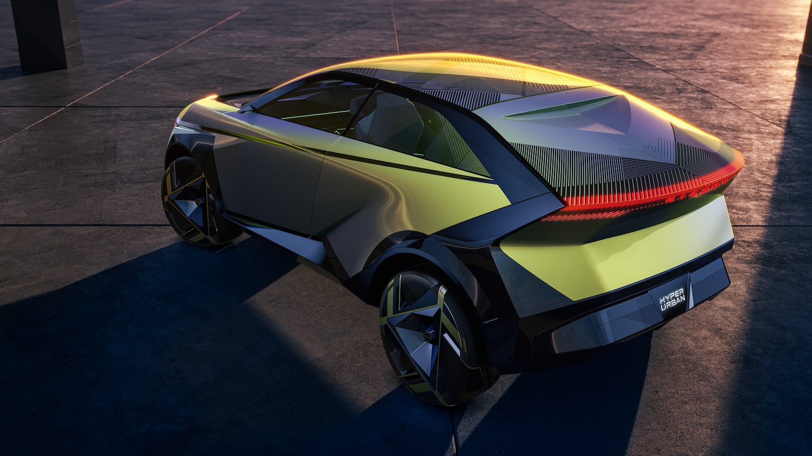 The lime yellow concept features front and rear scissor doors ala Lamborghini or McLaren, as well as angular sheetmetal and wide tires in effort to endow the Nissan Hyper Urban with a tough, rugged urban SUV aesthetic.