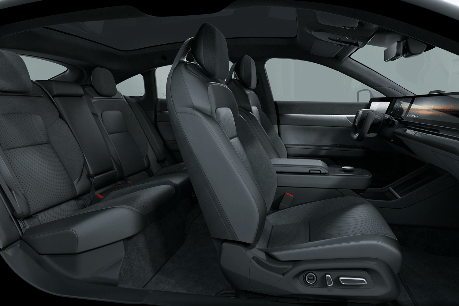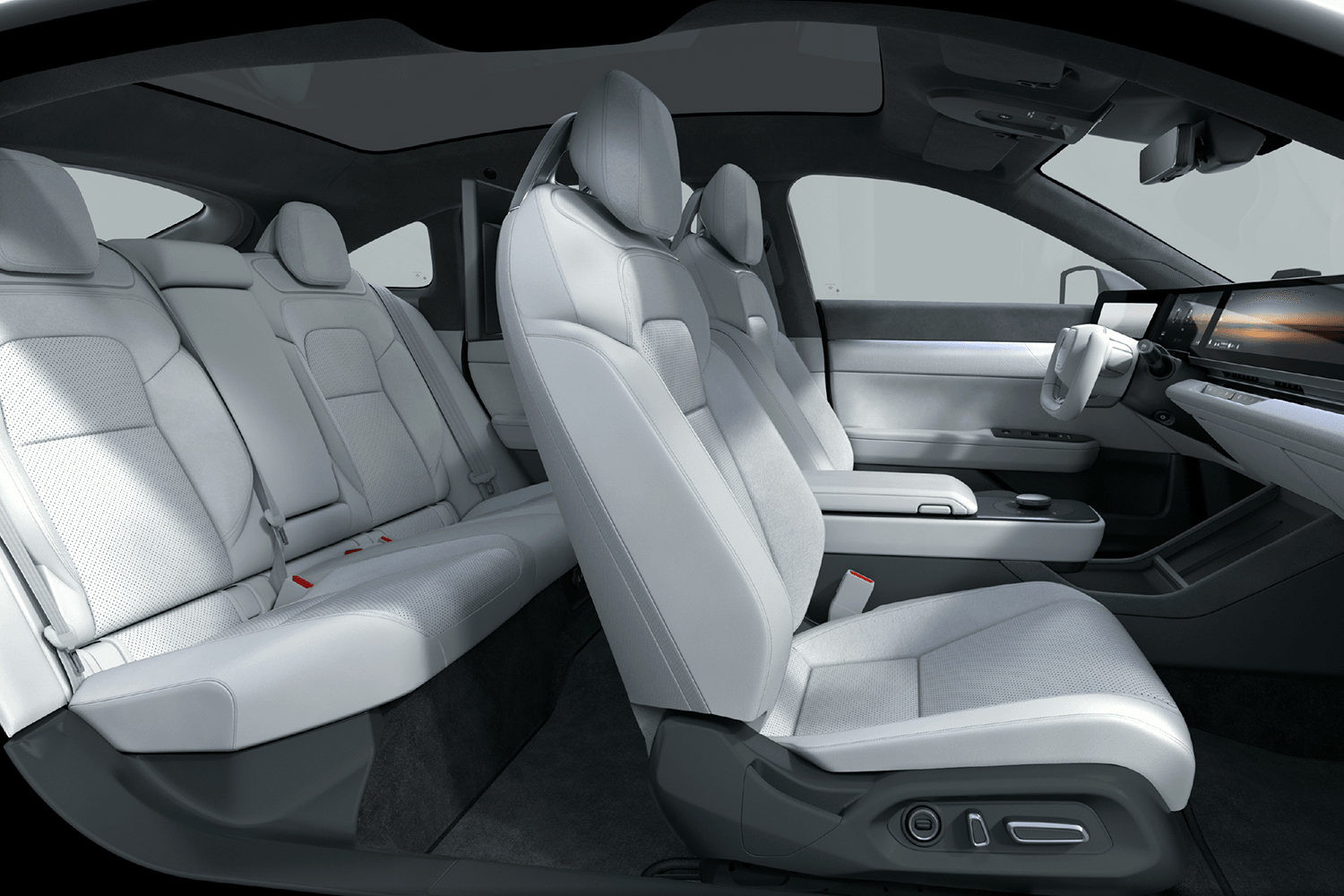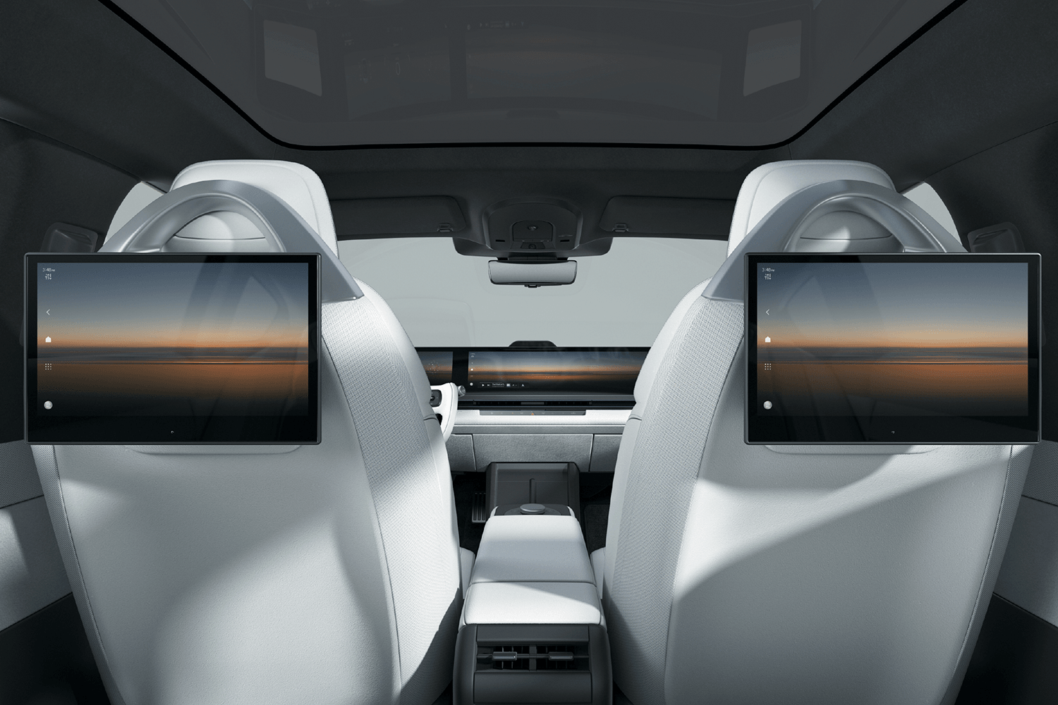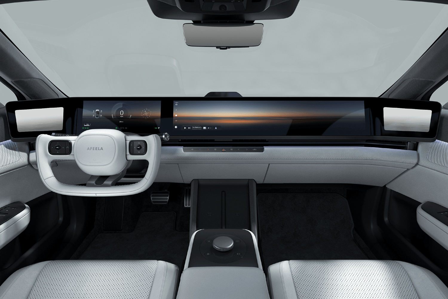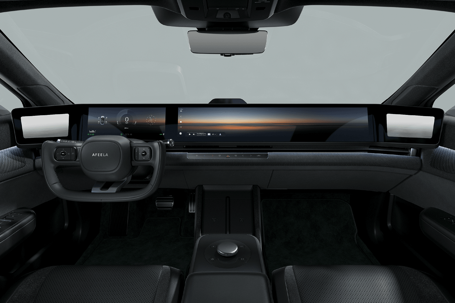 Inside, the Afeela 1 features a tech-laden interior with a full-width screen spanning the entire width of its dashboard. The more expensive Signature trim gains a pair of touchscreens for the rear seat passengers. A yoke steering wheel is featured on the prototype, and soft ambient lighting can be seen throughout the cabin.